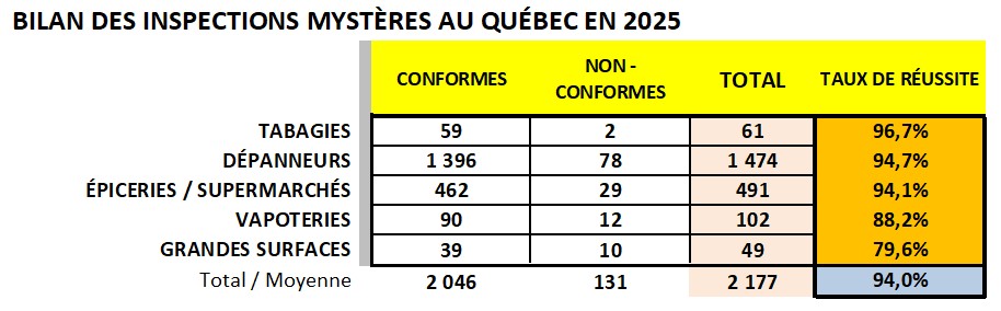 Un total de 2,177 inspections pièges ont été menées cette année auprès des détaillants de tabac par des inspecteurs mystères d’âge mineur, soit le même nombre pratiquement que l’an dernier (2,160);